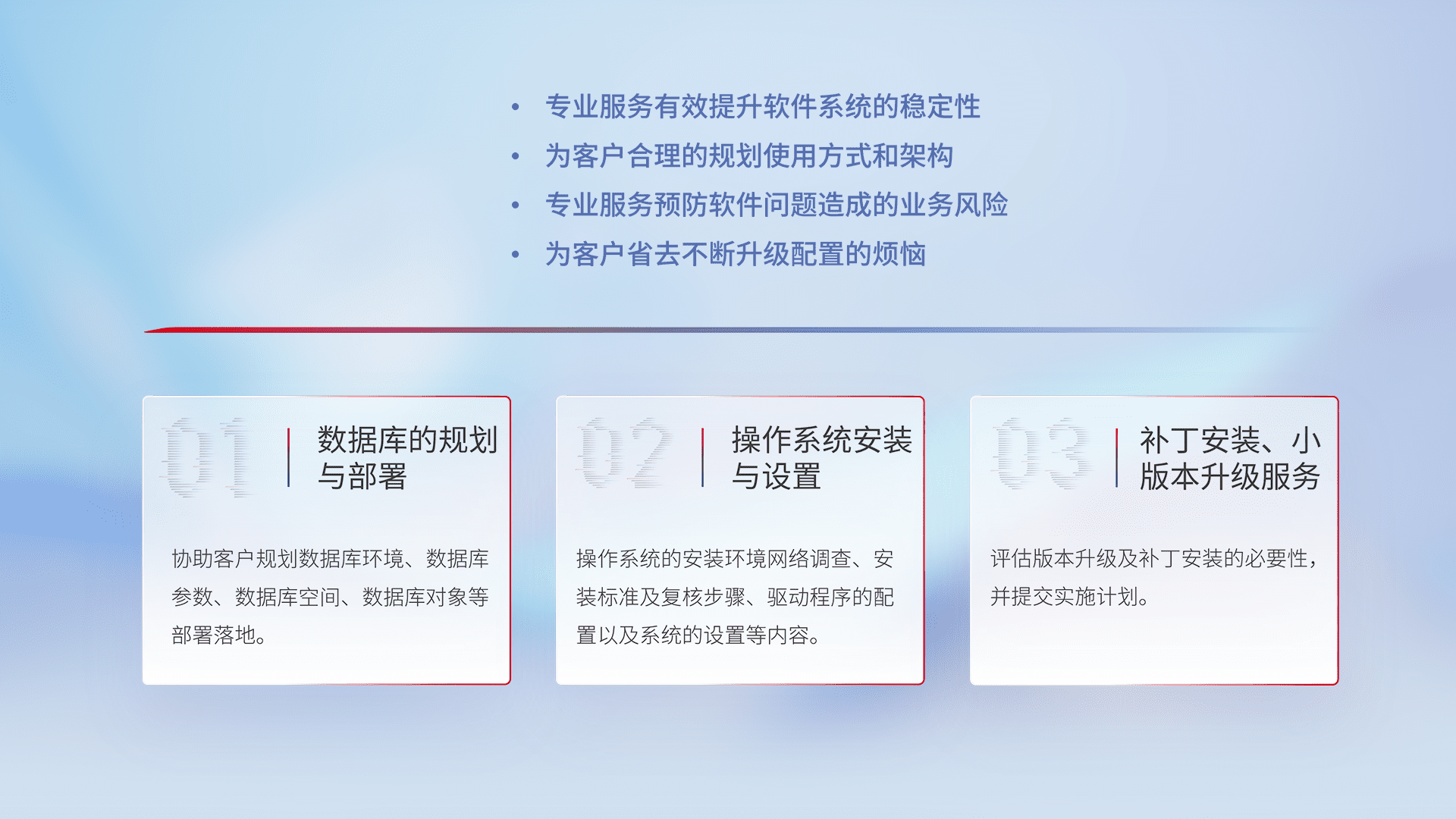为客户提供软件规模升级、、快速部署、、、按需配置的专业服务,,从数据库的规划与部署到操作系统的安装与设置,,再到补丁安装和小版本升级提供支持。。。。
